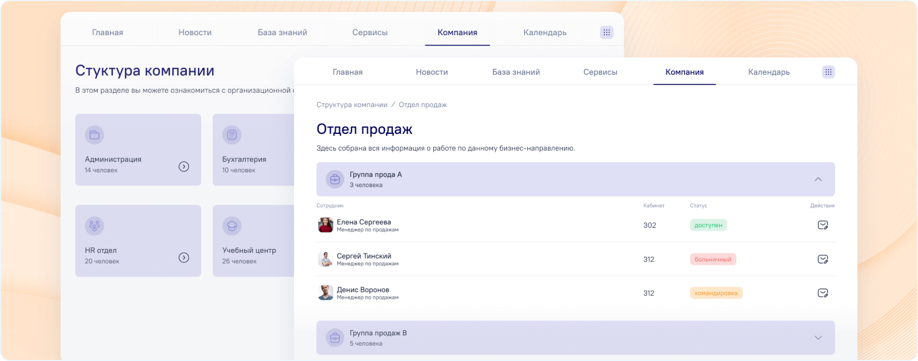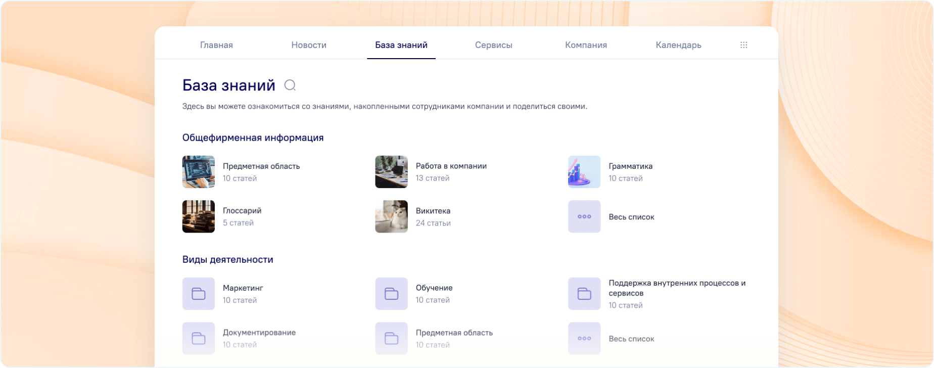 Корпоративный портал предлагает набор готовых блоков, которые можно перемещать, добавлять и удалять в зависимости от потребностей компании: