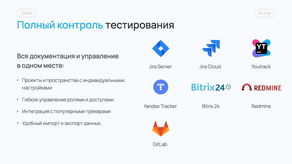 DoQA — российская TMS-система для эффективного управления тестированием цифровых продуктов. Включена в реестр отечественного ПО № 25443. Доступна в облачной и серверной версиях.