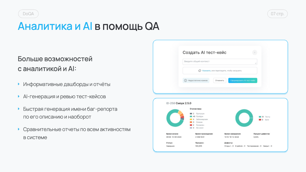DoQA AI — Генерация тест-кейсов и чек-листов на основе описания задачи. — Ревью тест-кейсов с рекомендациями по улучшению. — Автоматическое создание названий для баг-репортов.
