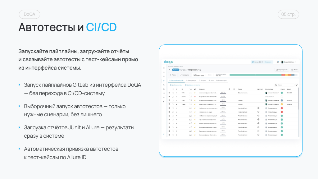 Автотесты — Загрузка отчётов о прогонах автотестов в форматах JUnit XML и Allure. — Автоматическая отправка результатов через публичный API или CLI-утилиту. — Результаты ручного и автоматизированного тестирования в одной системе — без переключения между инструментами.