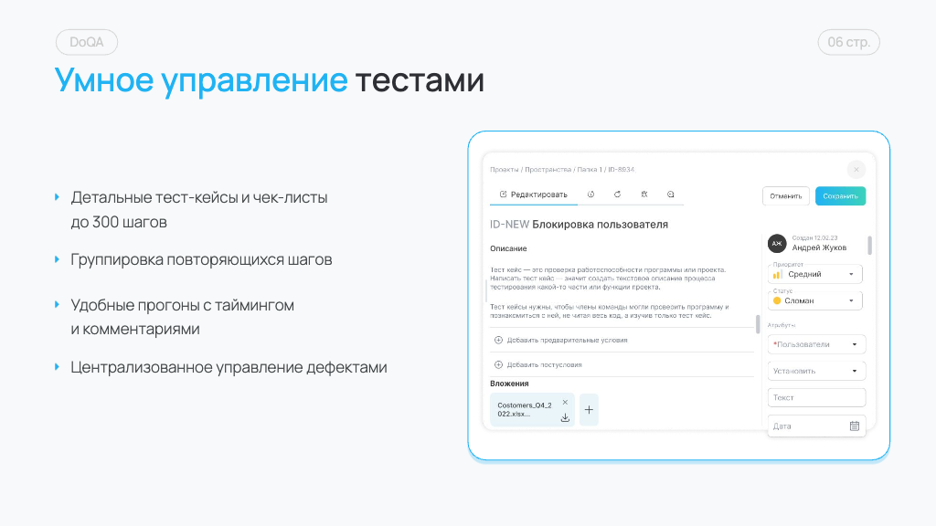 Управление тестовой документацией — Тест-кейсы и чек-листы объёмом до 300 шагов с описанием, вложениями и атрибутами. — Приоритеты, статусы, теги и ответственные для каждого теста. — История изменений с возможностью отката к предыдущим версиям. — Переиспользование повторяющихся шагов — изменения применяются ко всем тестам автоматически.