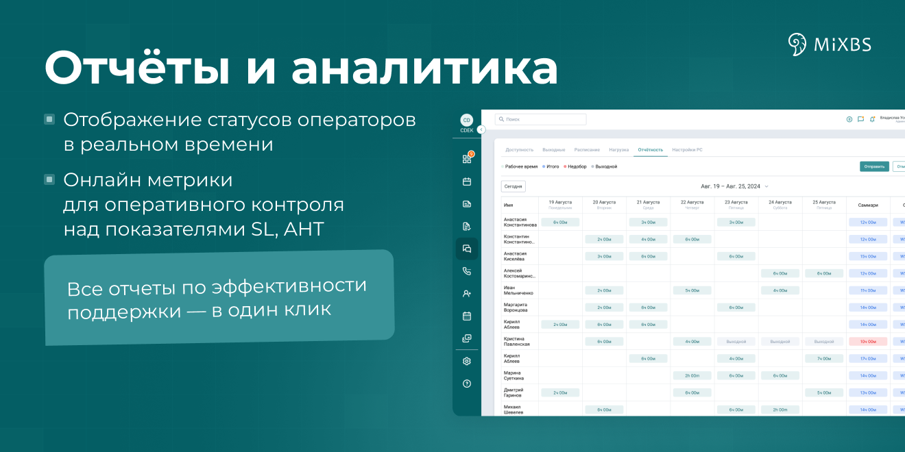 В ПО реализованы функции планирования и учета рабочего времени операторов, а также инструменты аналитики, обеспечивающие формирование отчётов и показателей по загрузке, качеству обслуживания и эффективности обработки обращений.