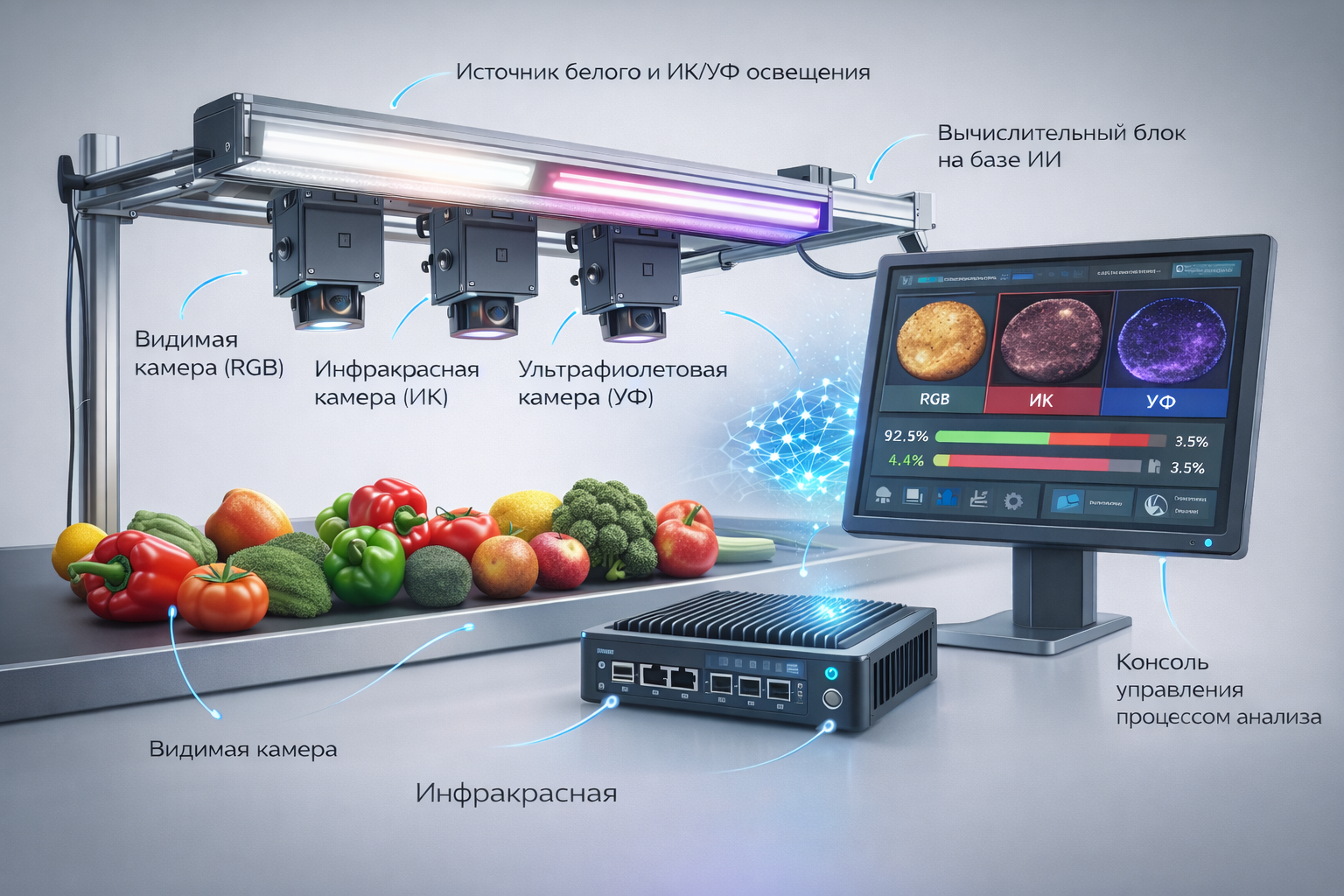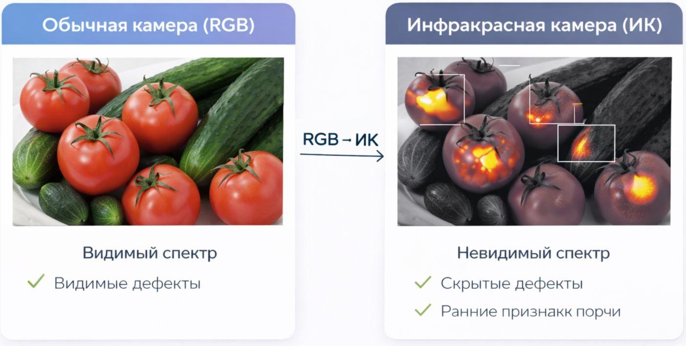 Система объединяет каналы видимого (RGB), инфракрасного (ИК) и ультрафиолетового (УФ) спектров, что позволяет одновременно анализировать как внешние характеристики объектов, так и их скрытые физические и химические свойства. Это дает возможность выявлять дефекты, недоступные для человеческого глаза и традиционных методов контроля.