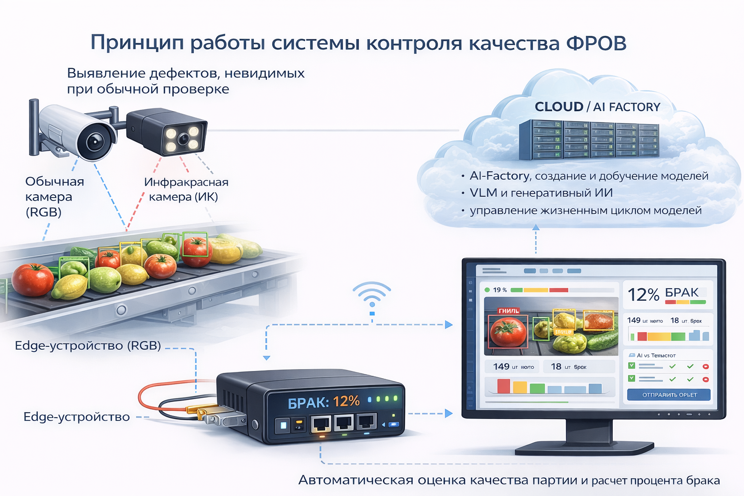 Система может работать как в режиме локальной обработки данных (Edge), так и в связке с облачной платформой, обеспечивая централизованную аналитику, накопление данных, дообучение моделей и масштабирование на уровне всей сети предприятий.
