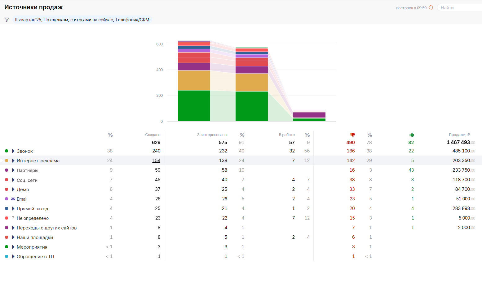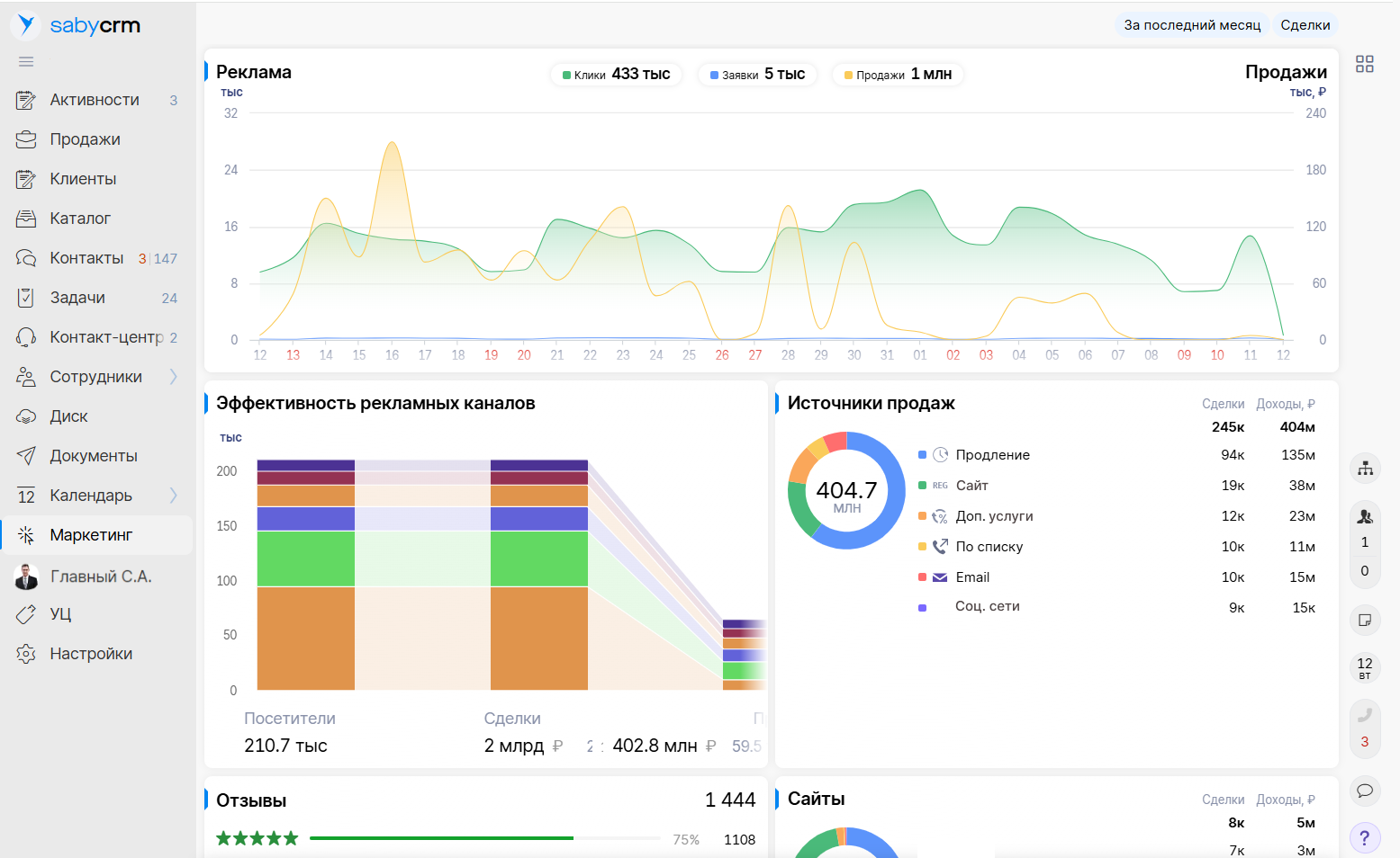 Подробная аналитика и отчеты. Контролируйте работу отдела продаж с помощью готового набора отчетов по сделкам, активностям и клиентам. Сквозная аналитика и коллтрекинг покажут, какие каналы продвижения реально приносят прибыль.