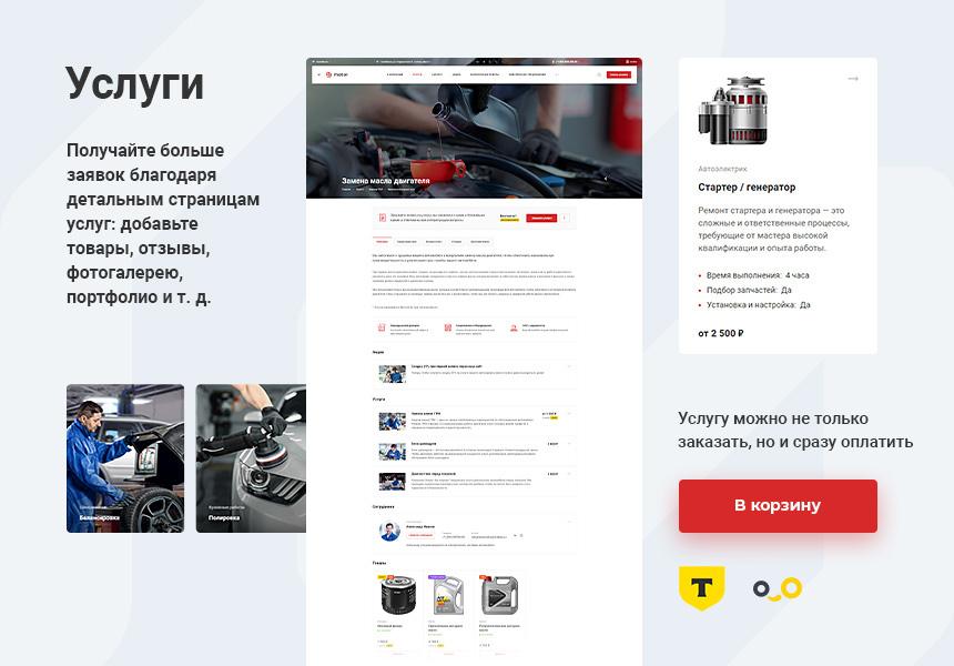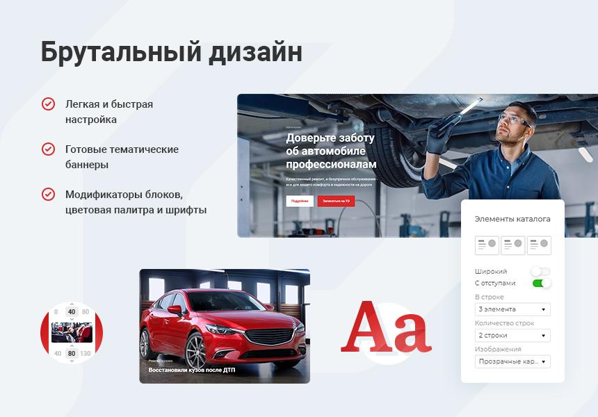 Аспро: Автосервис — готовый корпоративный сайт для станций техобслуживания, шиномонтажей и центров замены ГСМ. Решение создано специально под автомобильную тематику: брутальный дизайн, удобные карточки услуг, оценка ремонта по фото и запись через календарь помогают увеличить поток обращений и упростить работу с клиентами. Сайт легко адаптируется под мобильные устройства и поддерживает онлайн-оплату.