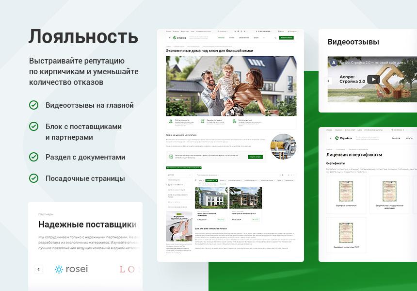 Аспро: Стройка 2.0 — это современное решение для строительной отрасли: застройщиков, подрядных организаций, проектировщиков и ремонтных бригад. В шаблоне предусмотрены специализированные инструменты для наглядной демонстрации объектов, удобный ипотечный калькулятор и адаптивный дизайн, который помогает привлекать клиентов и увеличивать конверсию в заявки.
